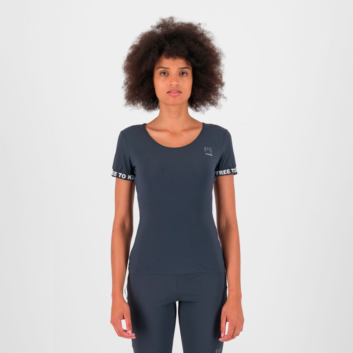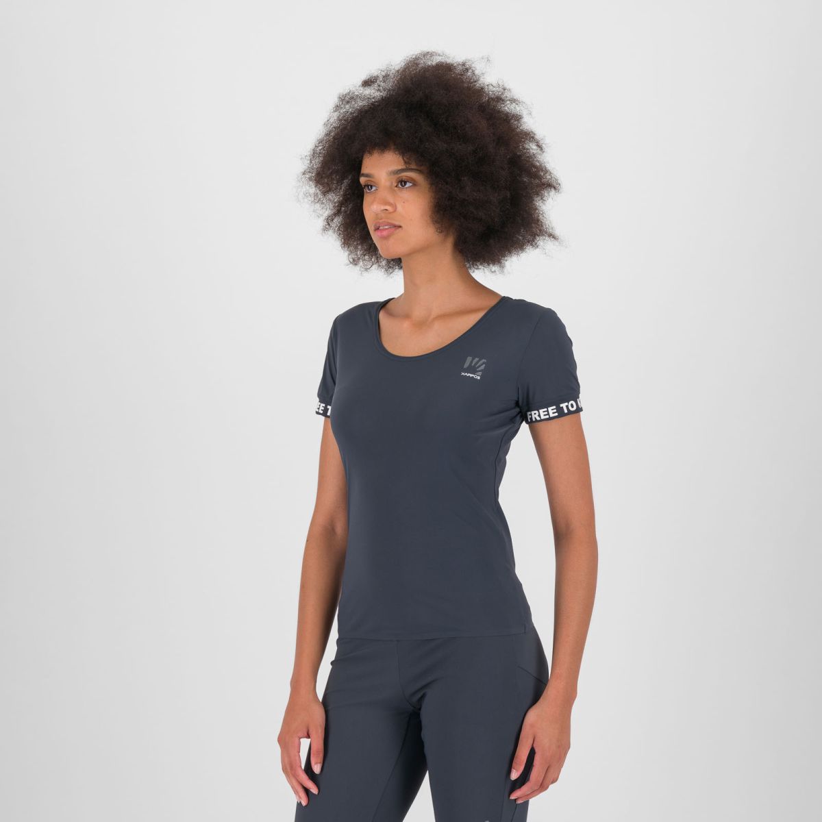 Okrúhly výstrih necháva vyniknúť dekolt, zároveň poskytuje dostatok voľnosti v oblasti krku. Dynamický strih neobmedzuje pohyb, kopíruje líniu ženského tela a pôsobí moderne a športovo zároveň.