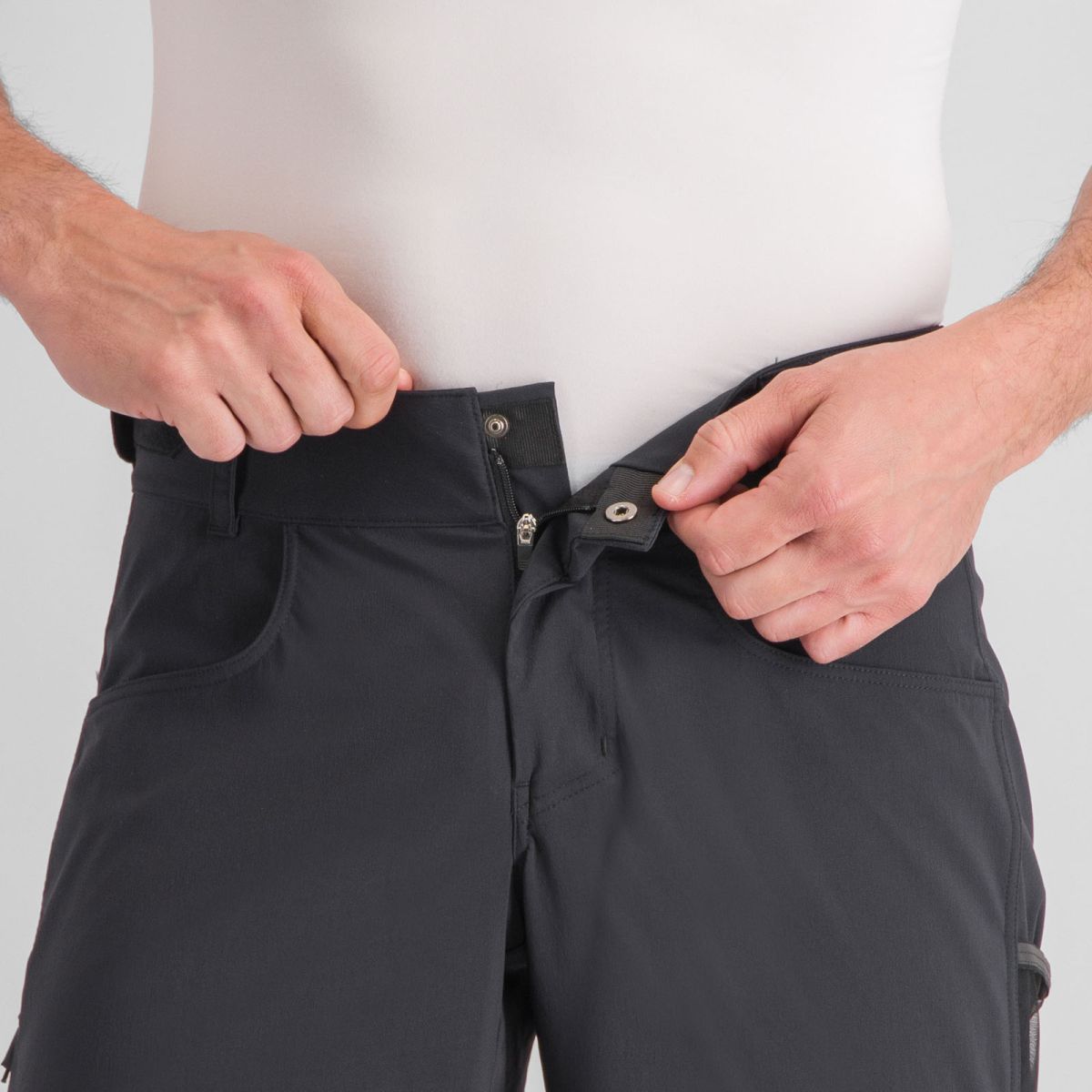 Cyklo kraťasy majú dve štandardné vrecká, dve sieťované vrecká na bokoch a jedno vrecko so zapínaním na zips, čo vám umožní praktické uskladnenie drobností. Regulácia pása na suchý zips na bokoch ti zabezpečí individuálne prispôsobenie a lepšie sedenie na tele. Okrem toho, kraťasy majú aj pútka na opasok, čo pridáva na ich praktickosti.