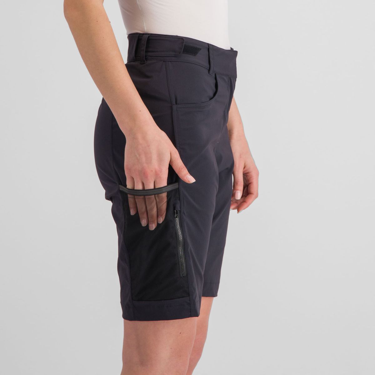 Cyklo kraťasy majú dve štandardné vrecká, dve sieťované vrecká na bokoch a jedno vrecko so zapínaním na zips, čo vám umožní praktické uskladnenie drobností. Regulácia pása na suchý zips na bokoch ti zabezpečí individuálne prispôsobenie a lepšie sedenie na tele. Okrem toho, kraťasy majú aj pútka na opasok, čo pridáva na ich praktickosti.