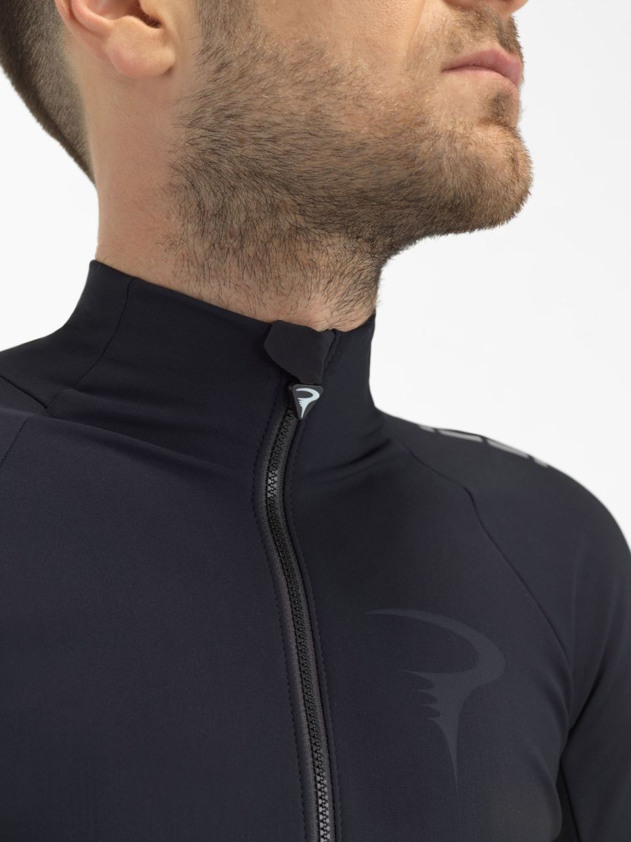 Minimálny počet švov znižuje trenie, riziko podráždenia pokožky a zvyšuje celkový komfort. Všetky švy sú vyhotovené trojihlovým stehom s hrúbkou len 5 mm, čo zabezpečuje extra pevnosť a odolnosť bez nadmerného množstva materiálu. Zvýšený golier má v zadnej časti riasenie, ktoré zachováva jeho tvar bez obmedzenia komfortu a pohybu krku. Tento dizajn poskytuje dodatočnú ochranu pred chladom a vetrom, čo je dôležité pre udržanie tepla v oblasti krku. - Inovatívne materiály