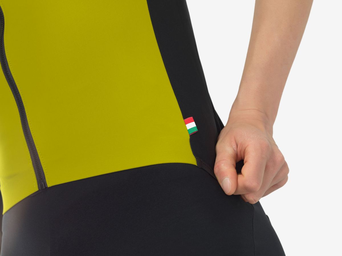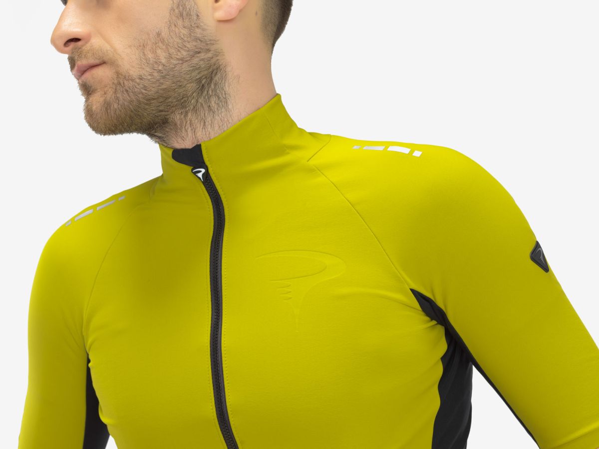 Dres je vyrobený z vysoko elastického materiálu, ktorý sa prirodzene prispôsobuje tvaru tela. Raglanový strih rukávov zvyšuje pružnosť a zabezpečuje dokonalé priliehanie. Predná časť dresu je v strede pri zipse mierne vyššia, čo zlepšuje jeho sedenie na tele počas jazdy. Minimálne množstvo švov a ich tenké prevedenie (3-ihlové prešitie s hrúbkou len 5 mm) eliminujú trenie a zvyšujú odolnosť. - Bezpečnostné prvky: