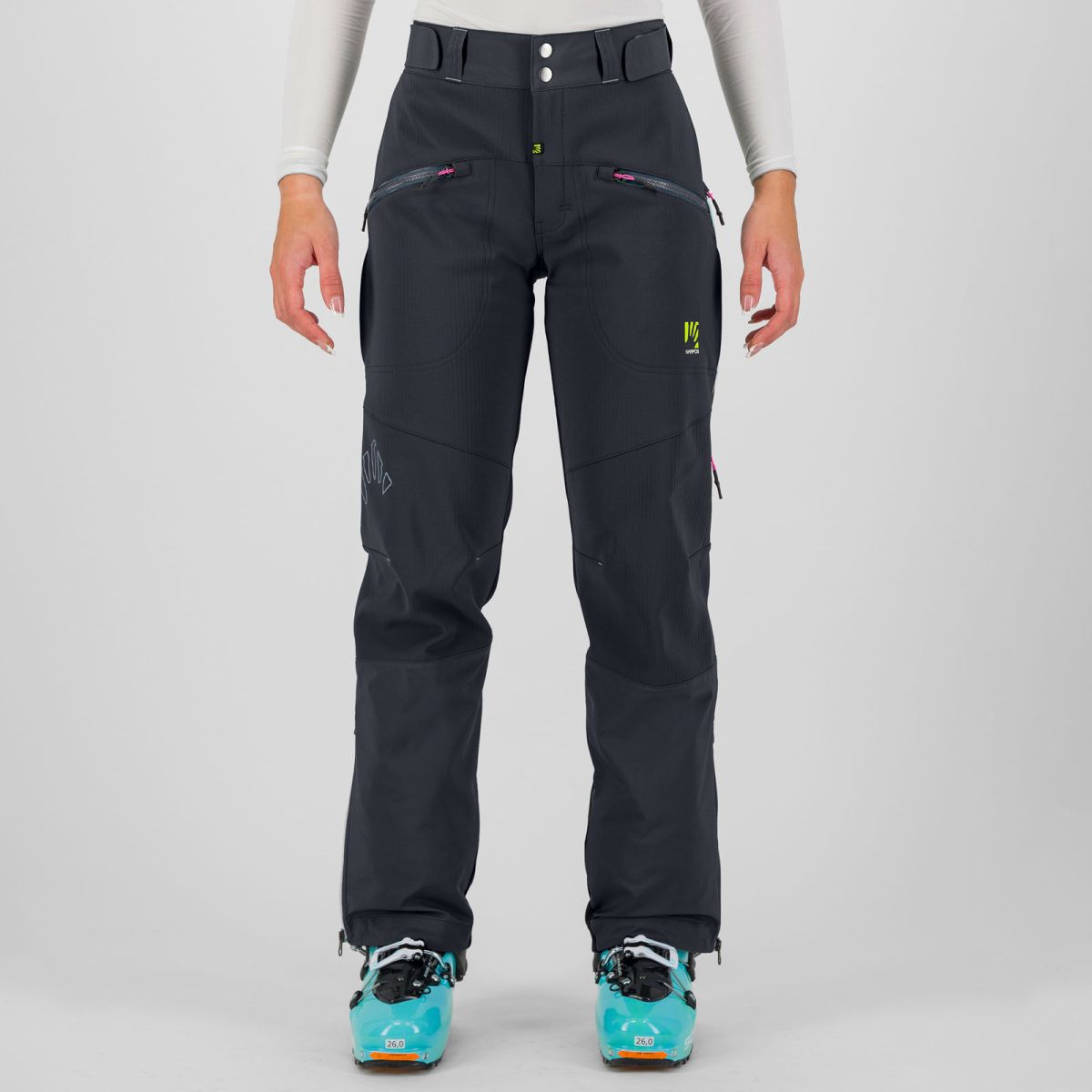 Skialpové nohavice Karpos Marmolada sú vhodné aj do veľmi nepriaznivého počasia a náročného terénu. Kombinácia funkčných materiálov zabezpečuje ochranu pred vetrom, snehom, dažďom a samozrejme chladom. Horná časť nohavíc je vyhotovená z K-Dry materiálu (vodný stĺpec: 20000mm, priedušnosť: 41000g/m²/24hod.) pričom zvyšok pozostáva z vetruodolného materiálu K-Shell s vodoodpudivým povrchom a flísovým vnútrom. Predná strana obsahuje dve vrecká so zipsami, ktoré umožňujú bezproblémové použitie horolezeckého postroja. Na bokoch sa nachádzajú veľké, priedušné, ventilačné otvory zabraňujúce prehrievaniu. Dolná časť je vybavená krátkymi zipsami a odolnou Cordurou®, ktorá chráni pred rozthnutím alebo poškodením od mačiek alebo ostrých hrán lyží.