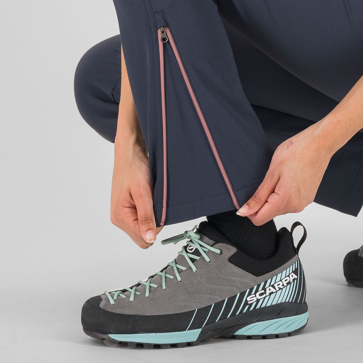 - v dolnej časti nohavíc sa nachádzajú krátke zipsy s klinom, ktoré umožňujú jednoduché obúvanie a vyzúvanie obuvi