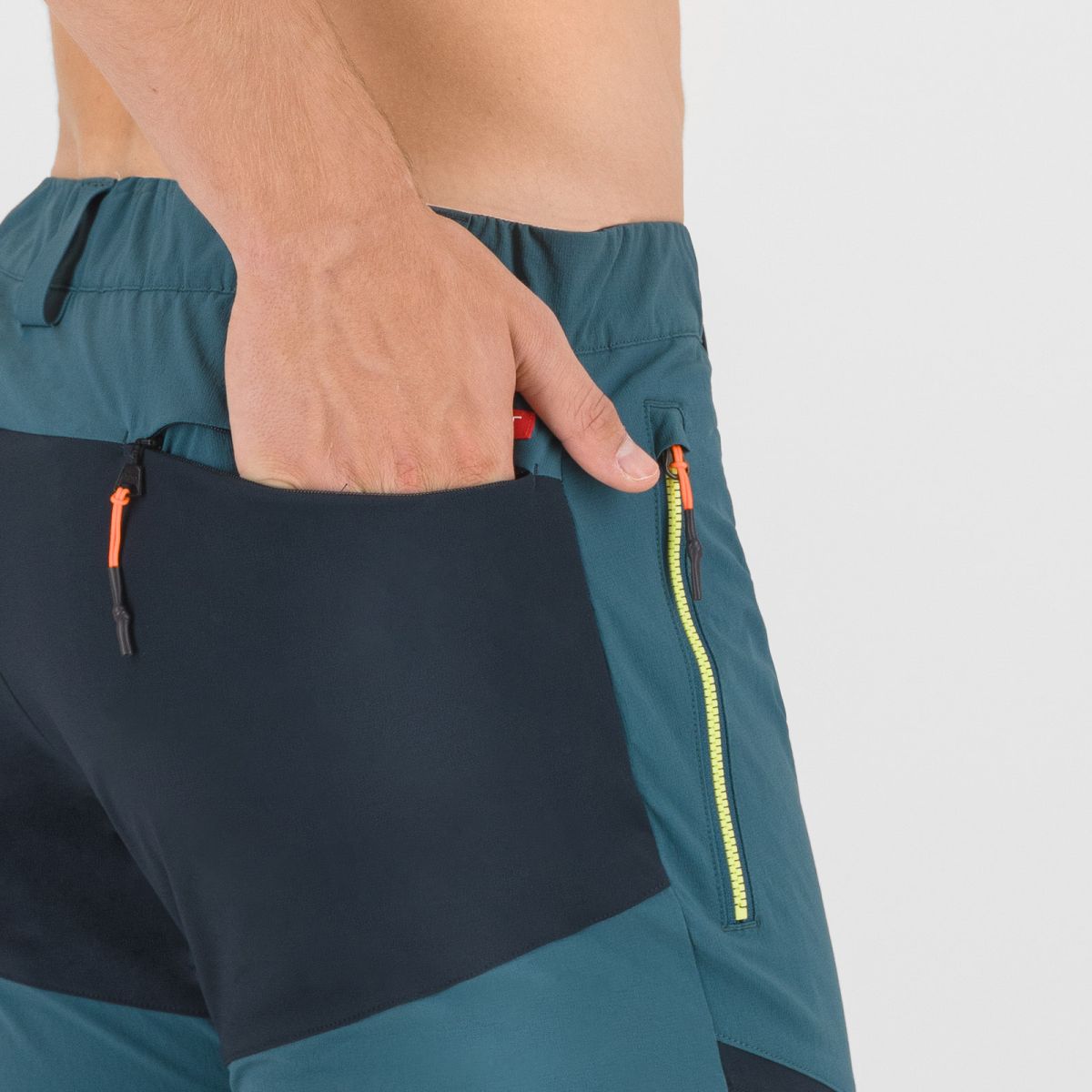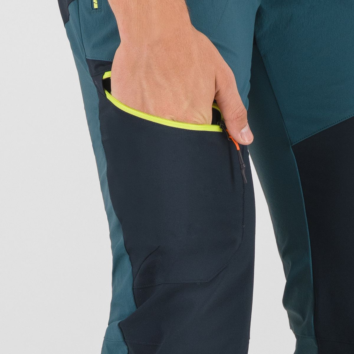 - Jedno bočné vrecko na zips na pravej nohavici – dostupné aj pri použití úväzu, ideálne na mapu, GPS alebo energetickú tyčinku.