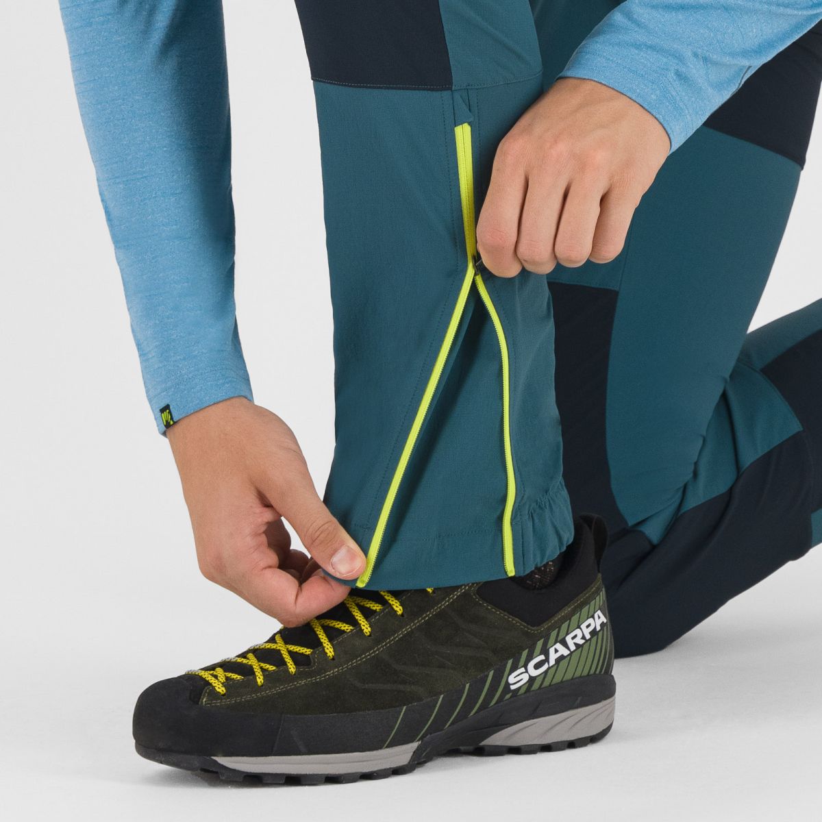 - Zipsy s klinom na spodnej časti nohavíc umožňujú jednoduché rozšírenie pre nosenie s technickou obuvou.