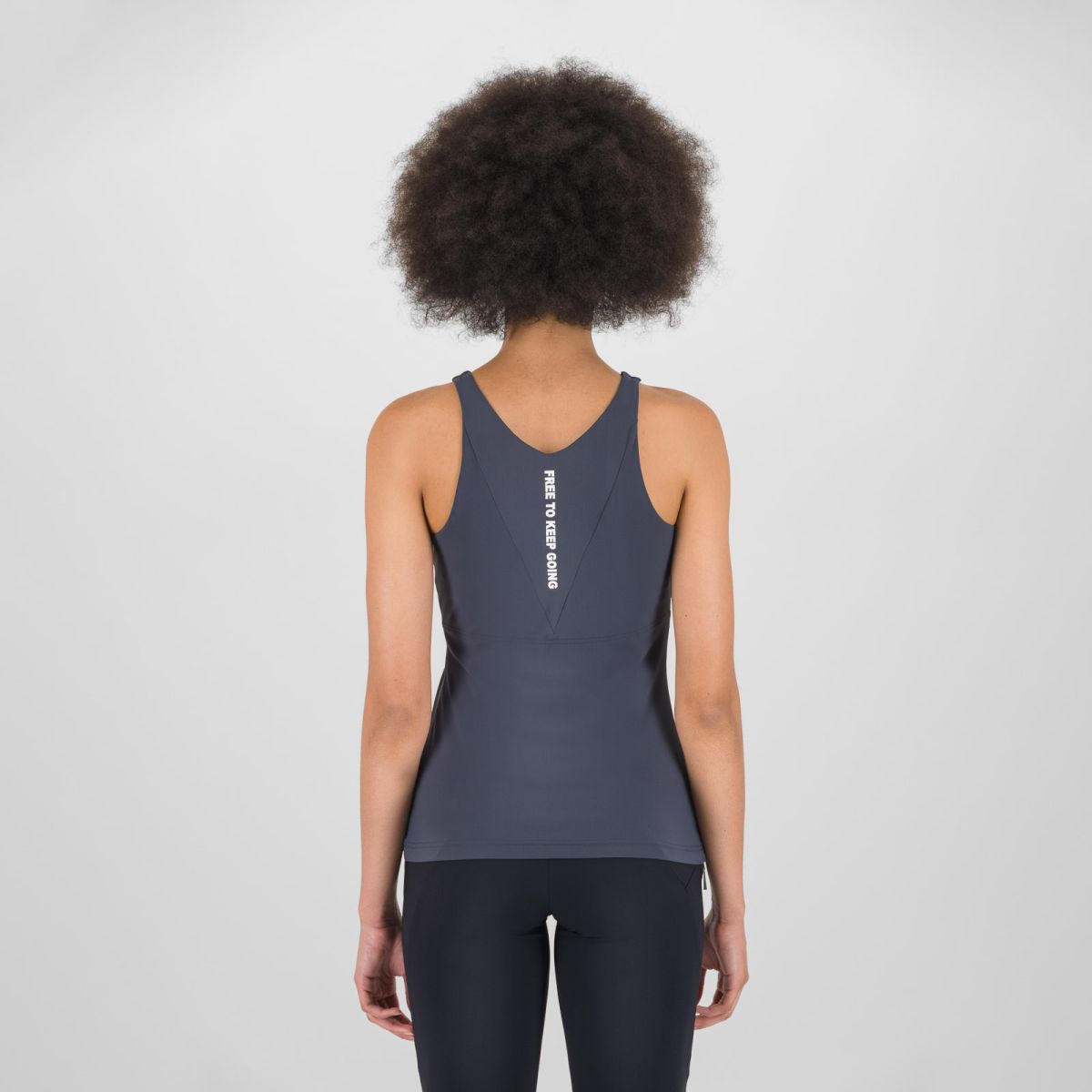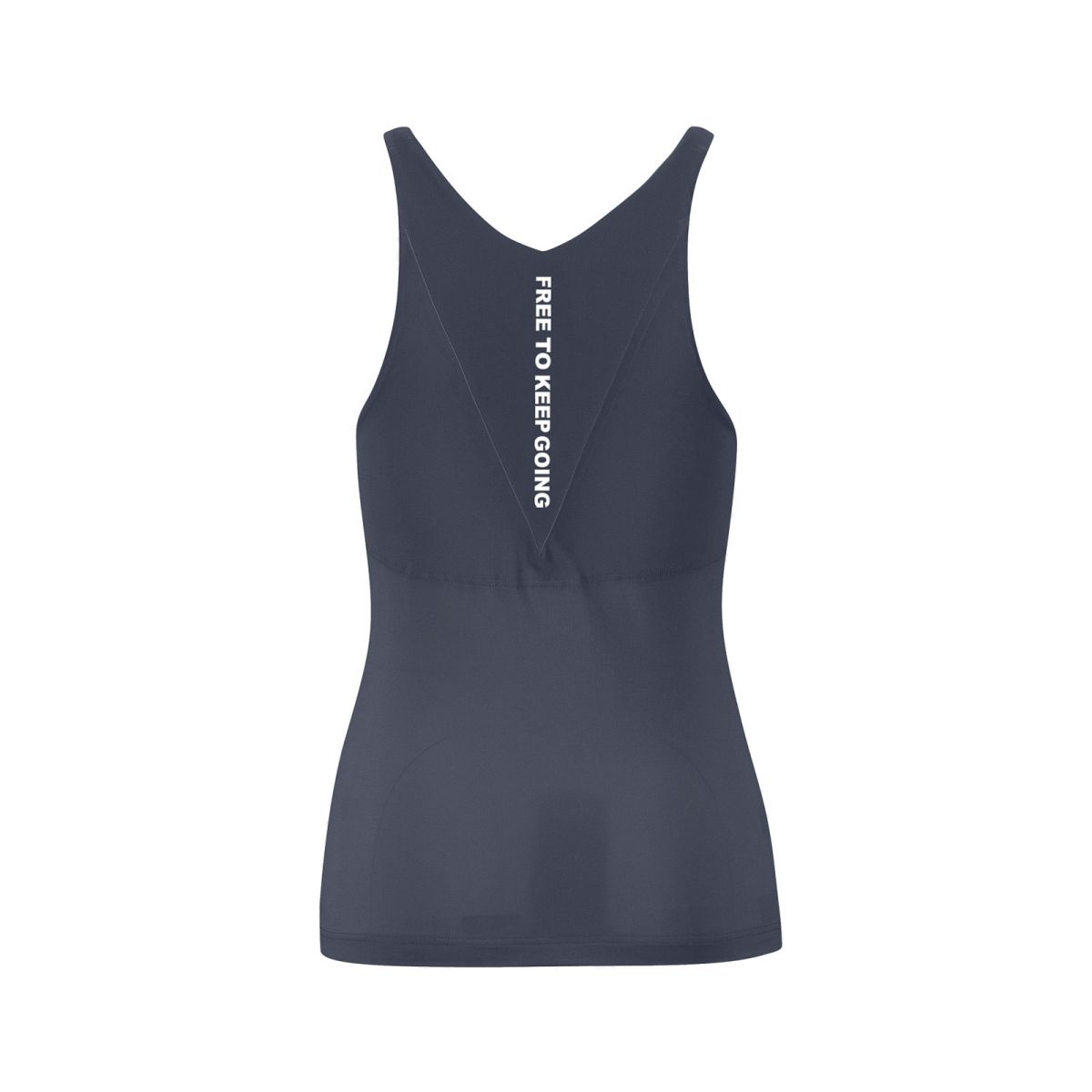Zadný diel s V-prestrihom a výrazným nápisom „Free to keep going“ nielenže vyzerá skvelo, ale zabezpečuje ešte lepšie odvetranie v kritickej oblasti medzi lopatkami a zároveň pridáva extra pružnosť v pohybe. Funkčná kombinácia materiálov pracuje presne tam, kde to telo potrebuje.