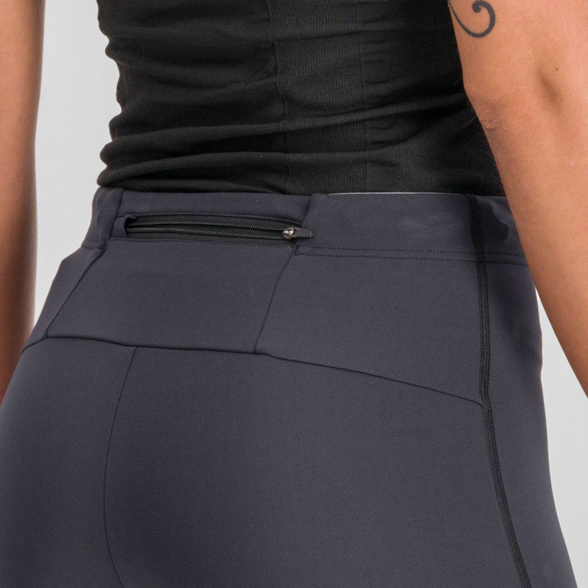 Pás je možné presne dotiahnuť vnútornou šnúrkou, takže legíny držia stabilne aj pri dynamickom pohybe. Vzadu sa nachádza malé vrecko s Camlock zipsom, kam sa zmestí energetický gél, kľúč alebo drobnosť potrebná počas tréningu. Celé prevedenie je čisté, funkčné a vytvorené pre mierne klimatické podmienky počas celého roka