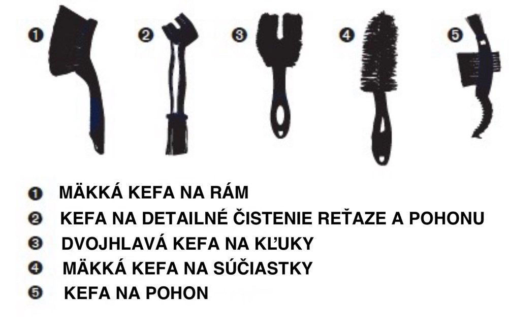 - Kefa na reťaz a pohon – špeciálne tvarovaná kefa pre dôkladné čistenie reťaze, kazety a prevodníkov