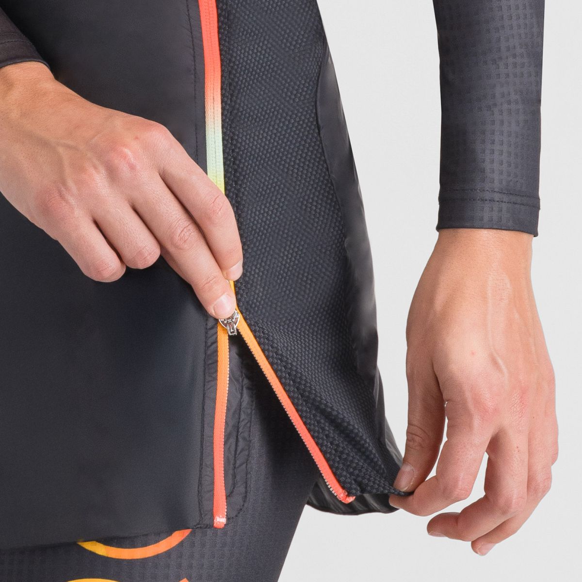 - Na bokoch sú umiestnené panely z priedušného a elastického termomateriálu, ktoré zvyšujú ventiláciu a zaisťujú voľnosť pohybu. Tieto panely zabezpečujú priedušnosť a zabraňujú prehriatiu aj pri intenzívnej aktivite.