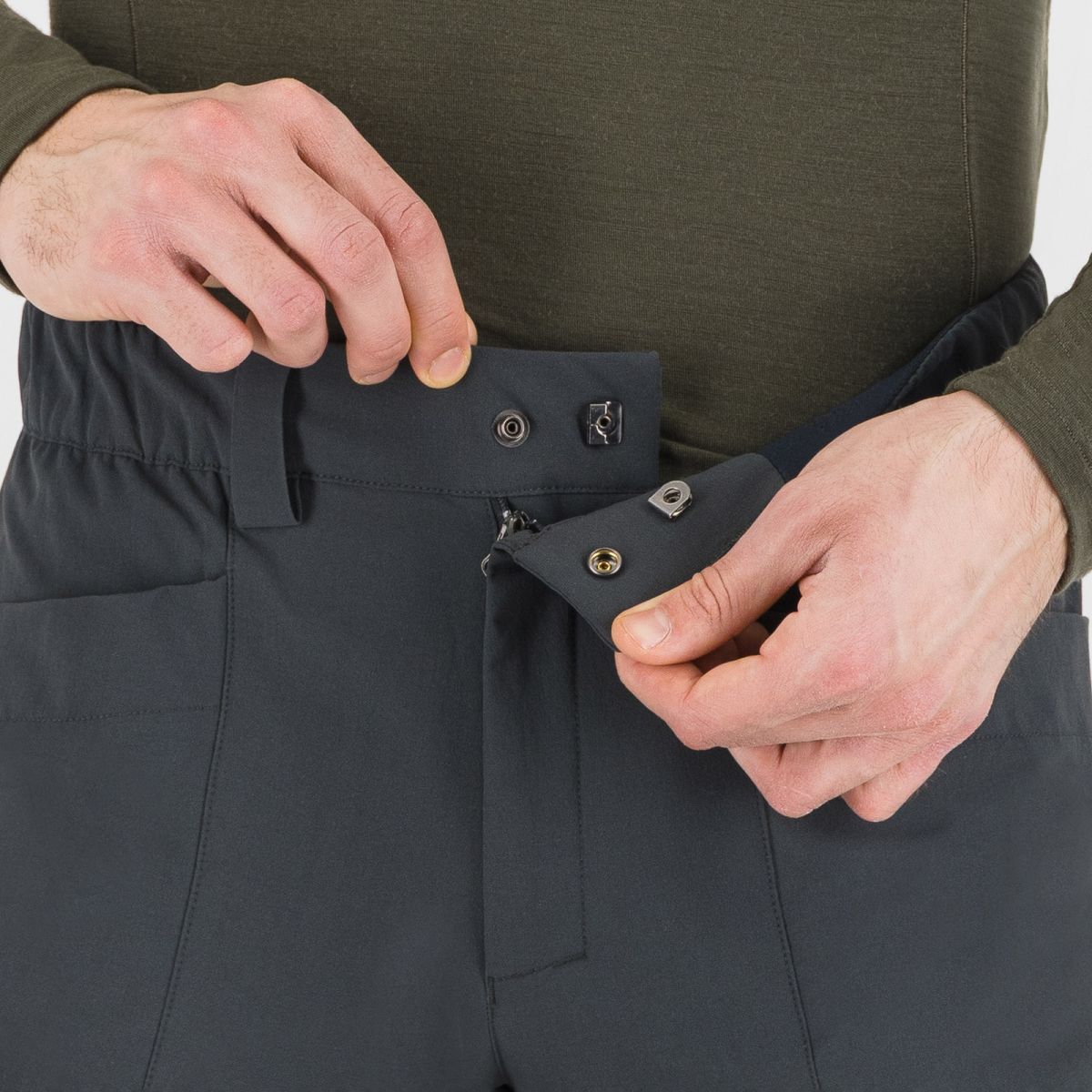 - Elastický pás je vybavený zapínaním na zips a dodatočným patentným gombíkom a háčikom pre bezpečné a pevné uzavretie