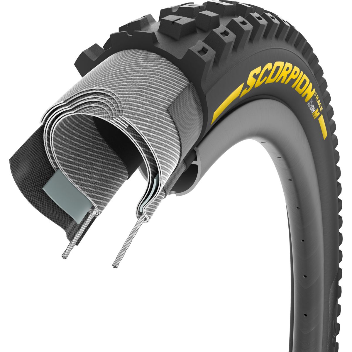 Pirelli Scorpion™ Race DH M predstavuje najuniverzálnejší plášť v produktovej rade Race DH a je výsledkom mesiacov vývoja s našimi továrenskými tímami. Dezén behúňa má vzorku špeciálne vyvinutú pre zmiešané terény, od tvrdých tratí až po stredne mäkké prírodné úseky trailov. Výstupky sú rovnomerne rozmiestnené medzi prostrednú časť, časť stredného náklonu a časť maximálneho náklonu. Ich výška a rozmery sú navrhnuté tak, aby poskytovali najlepšie správanie a pocit z jazdy v rôznych terénoch. Supermäkká zmes SmartEVO DH v kombinácii s veľkými výstupkami a tuhšej základnej zmesi zaisťuje optimálnu priľnavosť na všetkých typoch terénu bez ohrozenia celkovej stability pneumatiky. Konštrukcia DualWall+ je špecifická pre zjazd a je tvorená dvojvrstvovou kostrou 60tpi, ktorá je zosilnená výstuhou bočnej steny odolnou proti prerezaniu a gumovou vložkou. Takáto štruktúra poskytuje vynikajúcu ochranu proti prerezaniu a prepichnutiu a zároveň absorbuje malé vibrácie a veľké nárazy.